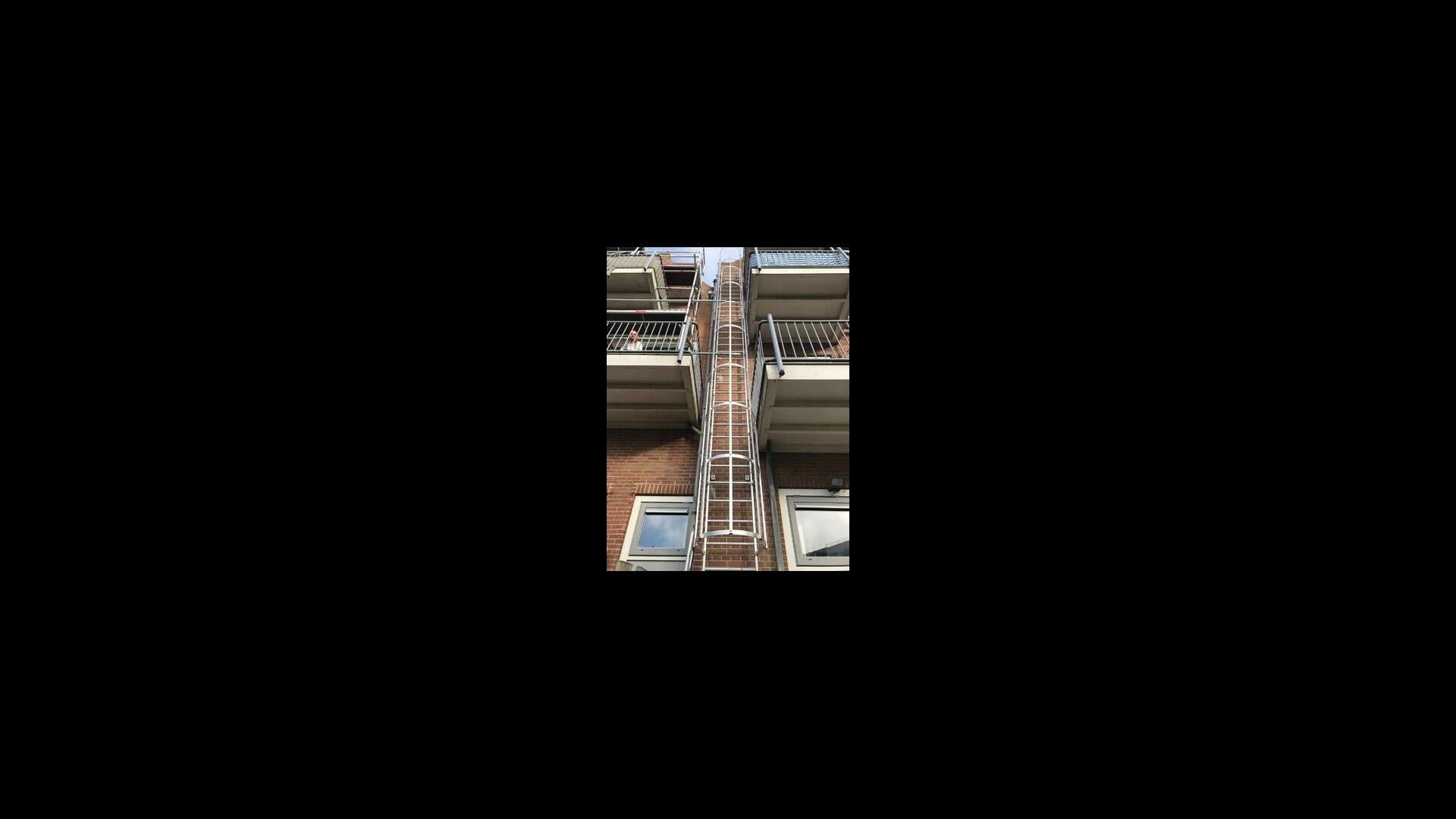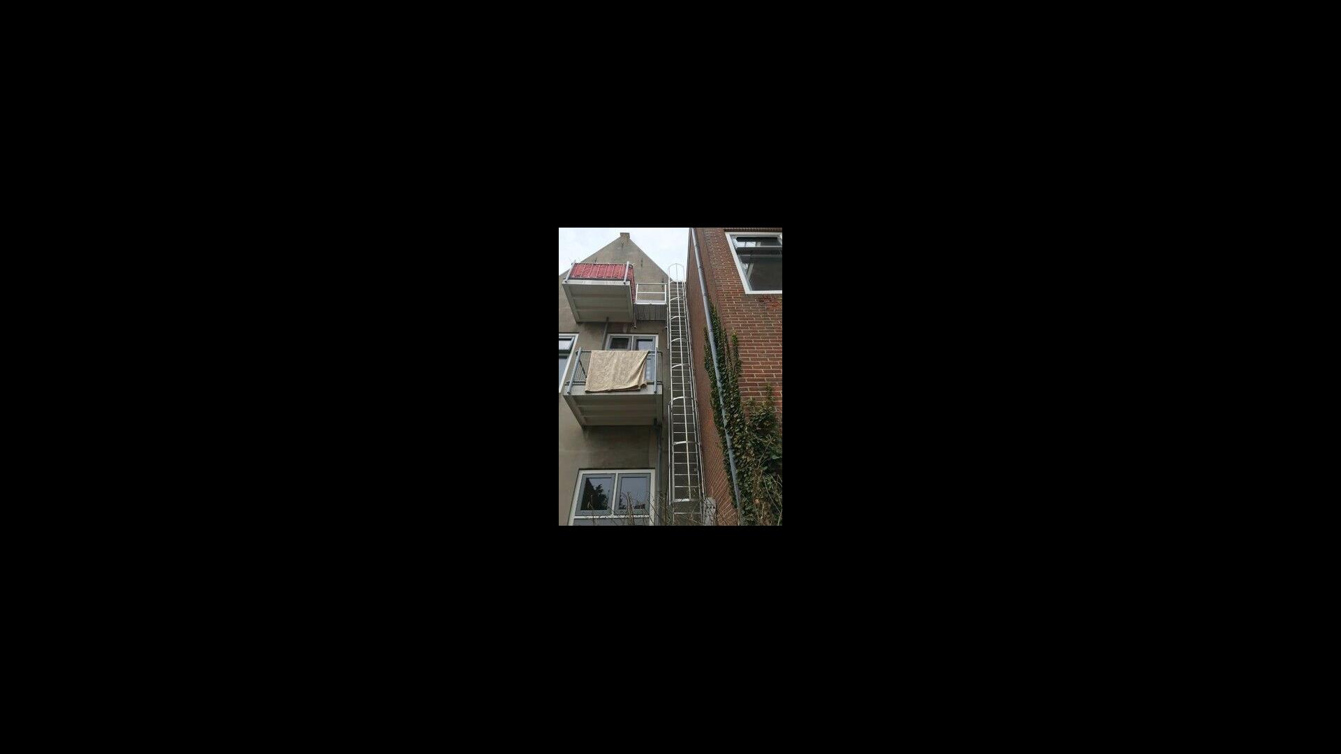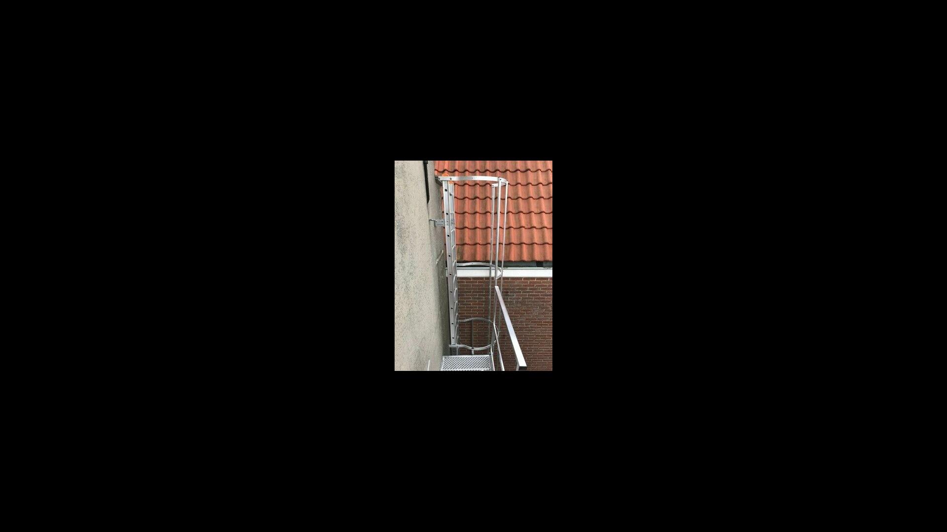 Kooiladder met balkon uitstap, met een vaste leuning, veilig omhoog klimmen, en veilig uitstappen met de balkon uitstap. Steiger & Ladderspecialist.