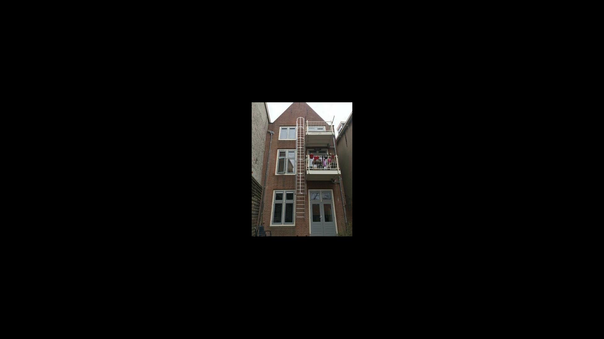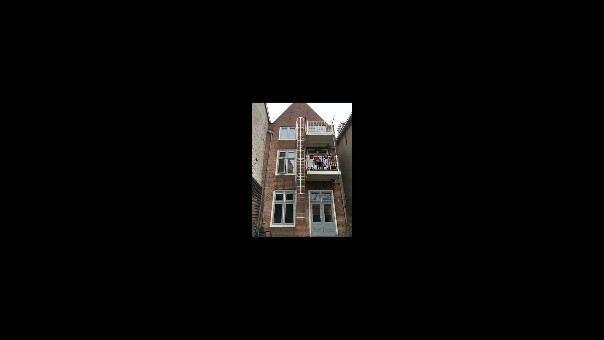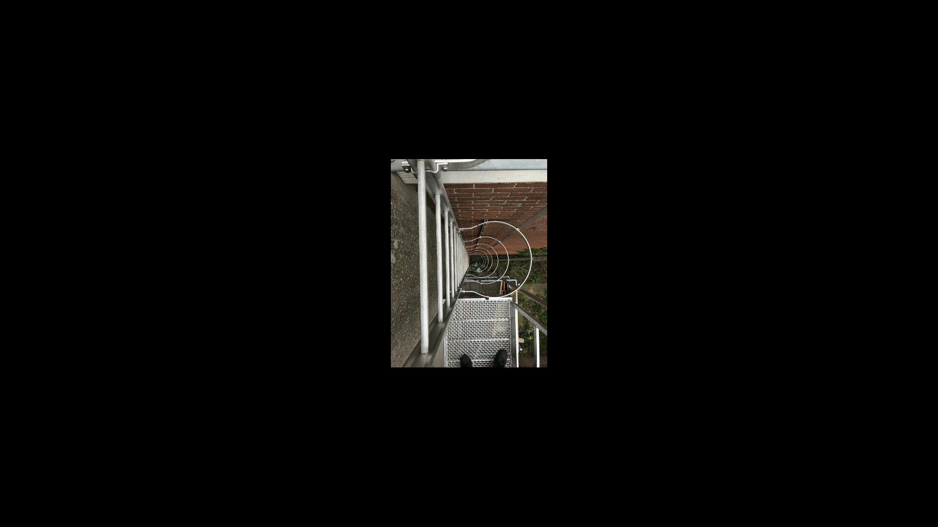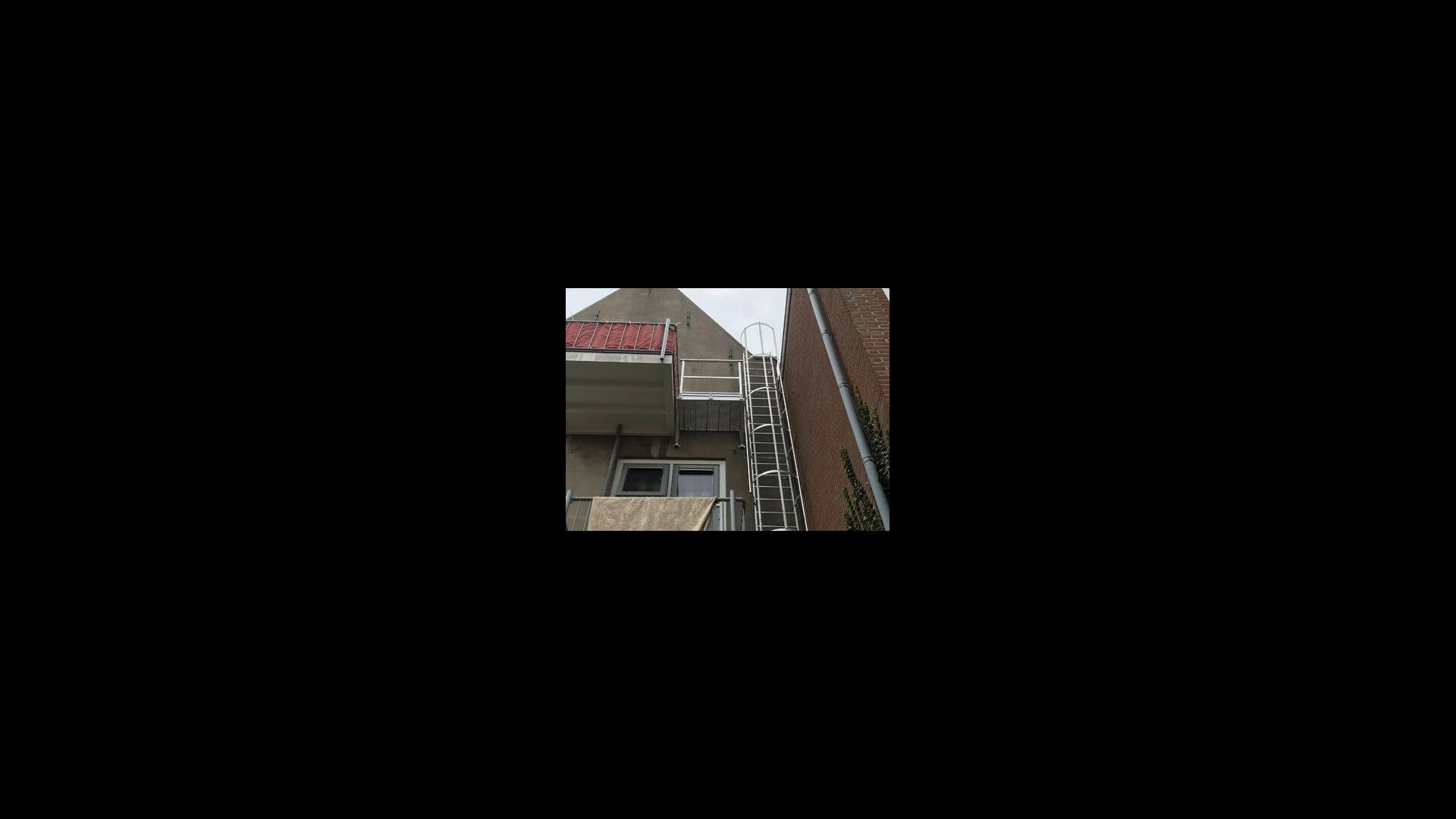 Kooiladder met balkon uitstap, met een vaste leuning, veilig omhoog klimmen, en veilig uitstappen met de balkon uitstap. Steiger & Ladderspecialist.