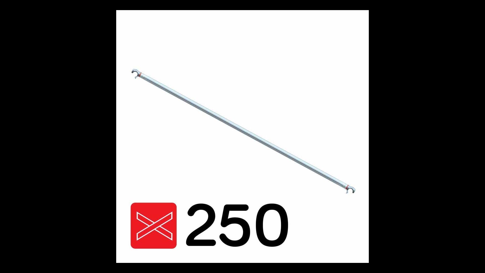 Rolsteiger diagonaal schoor 250 cm, schoren zijn geschikt voor alle type rolsteigers met een platform lengte van 250 cm hart op hart haken van het rolsteiger platform.